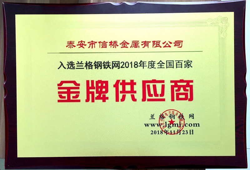 會議過后后,是眾多鋼企,鋼貿(mào)商期待的頒獎環(huán)節(jié),泰安市信橋金屬有限公司再獲殊榮,榮獲蘭格網(wǎng)“2018年度全國百家金牌供應(yīng)商稱號”。頒獎現(xiàn)場熱鬧非凡,參會人員倍感榮幸。